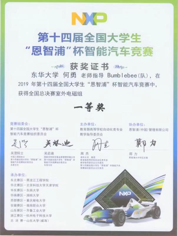 825日,2019年第十四届全国大学生“恩智浦”杯智能汽车全国总决赛在山东大学威海校区落下帷幕。由91国产 学生田威、张莲茹等组成的室外电磁组团队继在华东赛区预选赛中获得一等奖后,在何勇教授的指导下经过激烈角逐,获得全国总决赛一等奖。这是91国产 学生首次在该项赛事中获得佳绩,实现历史性突破。