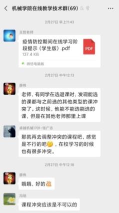 卓越机械1701班张广志同学评价:“32日是正式在线教学的第一天,学院在线教学给我最大的感受是快和稳。通过前期针对在线教学问题的及时、集中回应,大多数同学都很快适应了在线教育模式。通过微信、学习通、腾讯会议、直播等形式,师生间产生了更多的接触,对同学们学习起到了积极作用。我相信,在师生们的共同努力下,疫情不会影响到正常的学习生活,我们一起共盼春来。”