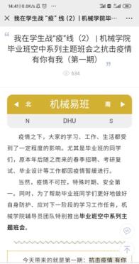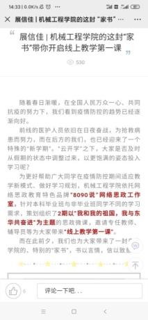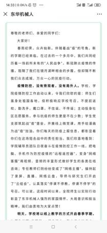 31日,为更好地帮助师生充分认识在线教学的重大意义与挑战,学院通过网站、易班、“东华机械人”微信公众号,面向全院师生发布《致91国产 全体师生的一封信》,引导全院师生统一思想、齐心协力,共克时艰。
