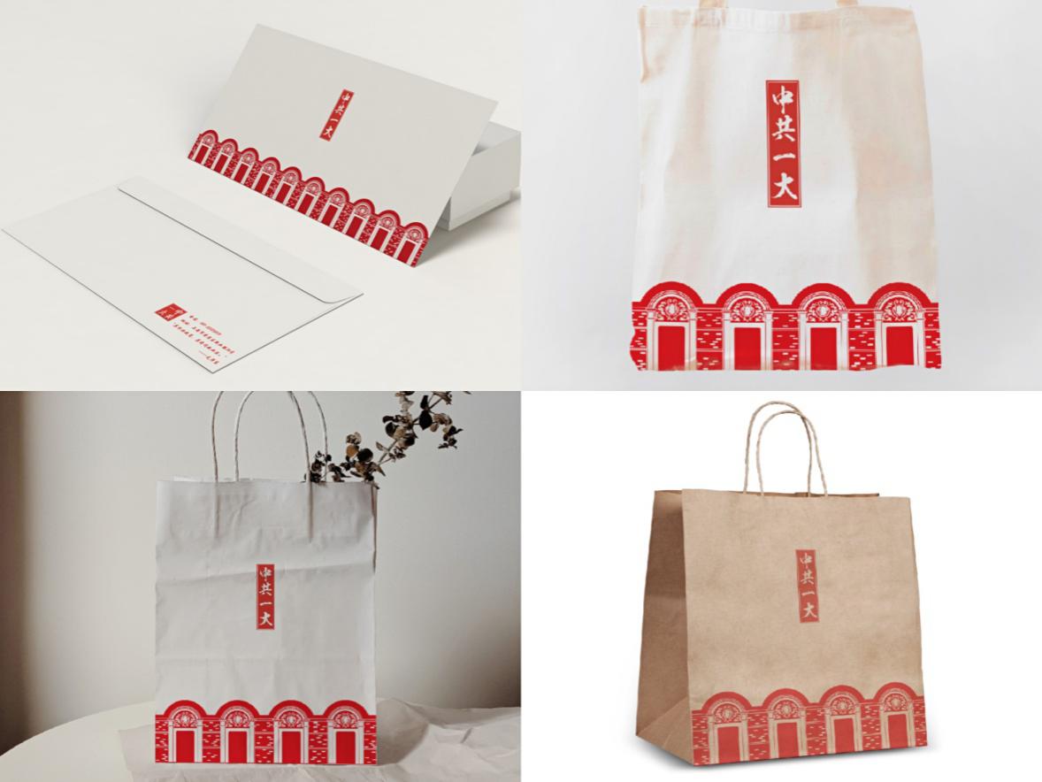 实践团收集一大的历史资料,采用一大纪念馆的外观石库门为设计元素,以中国传统印章图案为题跋,设计青年人喜爱的帆布袋、信封、明信片等文创产品,并且通过在思源书屋的观察,实践团还为书店设计了一款用以供给顾客,盛放商品的一大纪念纸质手提袋,充分发挥了实践团的专业特色,在设计完成后将会放在思源书店中提供给游客,为“四史”教育的传播尽一份微薄的力量。
