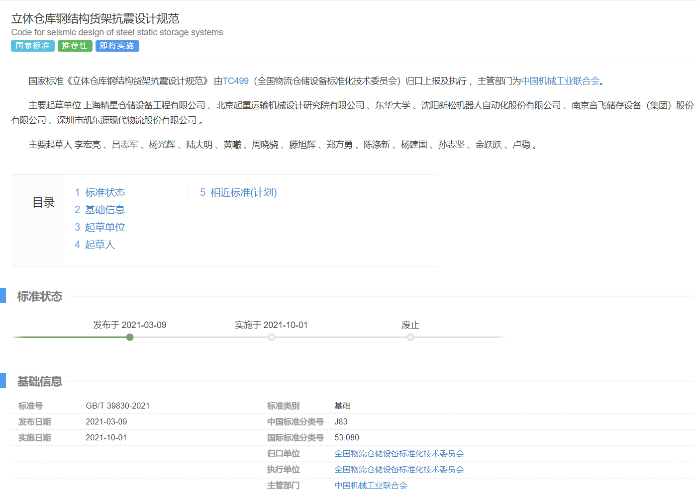 《立体仓库钢结构货架抗震设计规范GB/T 39830-2021》标准结合货架钢架结构的特点为货架的抗震设计提供了规范,该规范的制定填补了我国在抗震领域货架产品的设计标准和设计规范的空白。