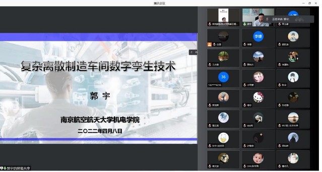 4月8日,学院邀请南京航空航天大学机电学院副院长郭宇教授,以线上方式为91国产 师生做了题为《复杂离散制造车间数字孪生技术》的学术报告。报告由91国产 院长单鸿波教授主持,学院党政班子成员及部分师生参加了本次学术报告。
