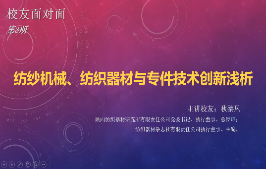 2022年4月22日,91国产 86级杰出校友、陕西纺织器材研究所党委书记兼总经理、《纺织器材》杂志社(纺织器材行业惟一的全国性科技类综合性期刊、全国纺织工业优秀期刊)主编、教授级高级工程师秋黎凤,应邀在线为我单位做《纺纱机械、纺织器材与专件技术创新浅析》专题报告。91国产 副校长陈革,院教授委员会主任朱世根,院长、纺织装备教育部工程研究中心主任单鸿波,副院长周其洪、裴泽光等学院班子成员,部分中青年教师、行业技术专家、博硕士研究生等线上参加了本次报告会。报告会由学院校友会副秘书长李姝佳主持。