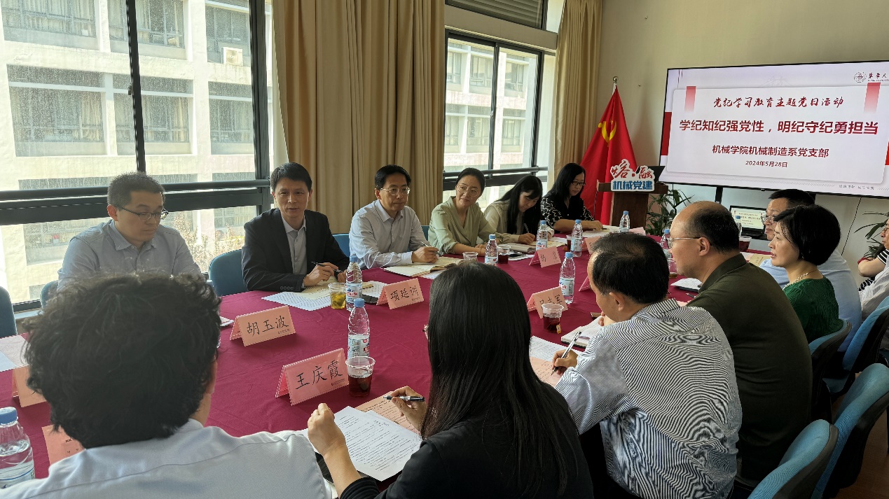 5月28日,党委副书记项延训参加机械制造系教工党支部党纪学习教育“学纪知纪强党性,明纪守纪勇担当”主题党日活动。东华大学党委组织部副部长胡玉波、机械学院党委书记王新厚、副书记杨蓉、专职党务干部黄璐以及机械制造系党支部全体党员参加。活动由机械制造系党支部书记鲍劲松主持。