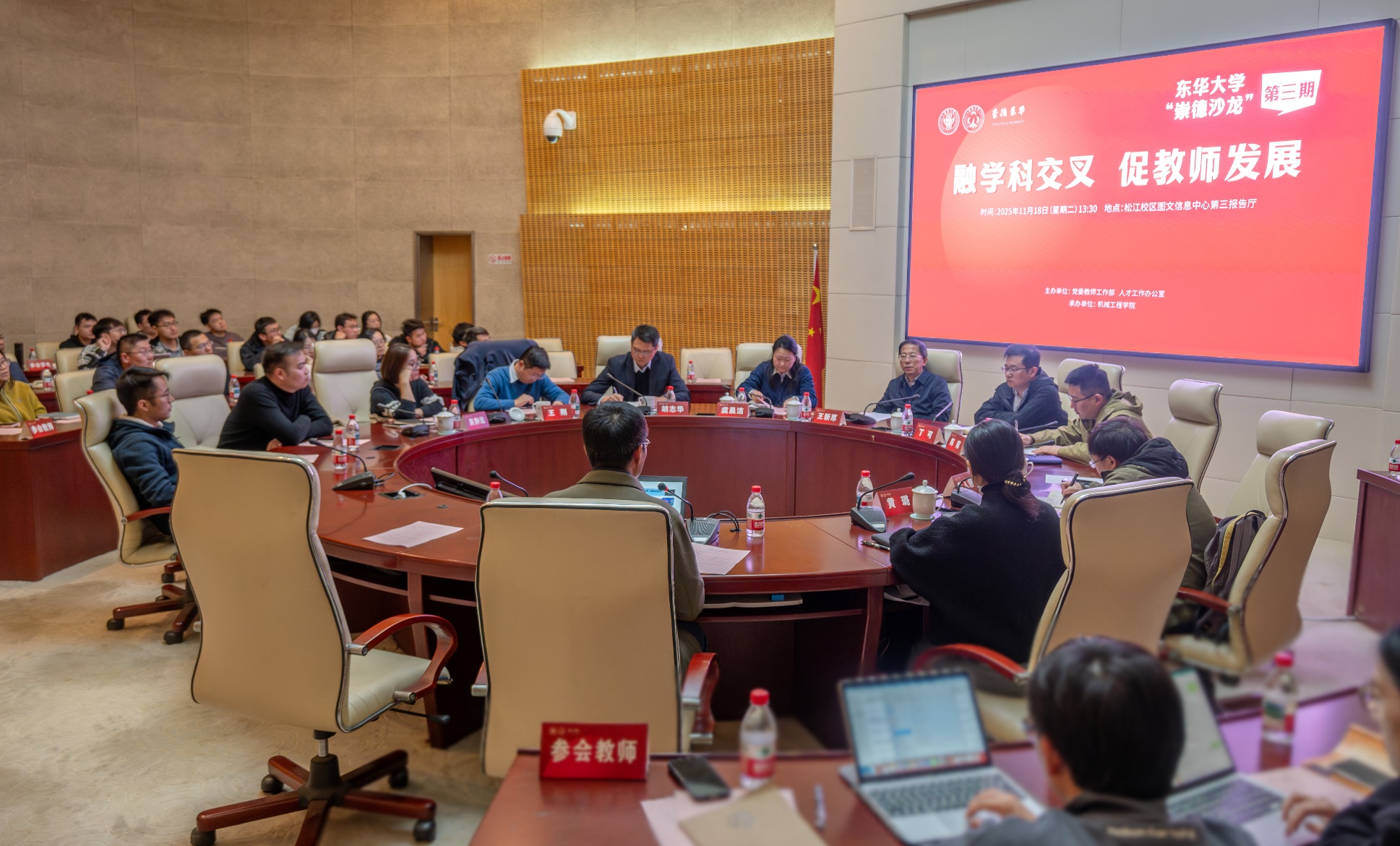 11月18日,“崇德沙龙”第三期在松江校区举办。本次活动以“融学科交叉,促教师发展”为主题,由党委教师工作部、人才工作办公室主办,机械工程学院承办。四位来自不同学院的专业教师聚焦集成电路相关领域前沿进行主题分享。活动由机械工程学院党委书记王新厚主持,吸引了各学院青年教师积极参与。