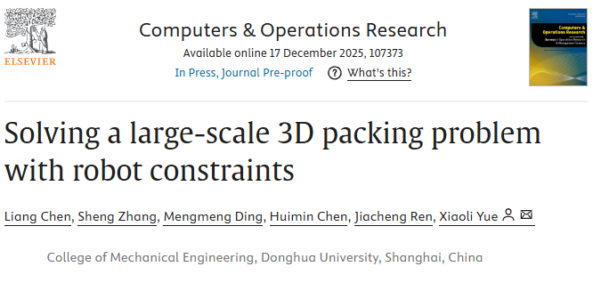 近日,我院智能装备与软件系统团队在机器人卡车装箱优化算法研究方面取得重要进展。该工作近期以“Solving a large-scale 3D packing problem with robot constraints(解决具有机器人约束的大规模三维装箱问题)”为题发表于《Computers & Operations Research》。东华大学机械工程学院为第一单位,青年研究员陈亮为本文第一作者,岳晓丽教授为本文通讯作者。