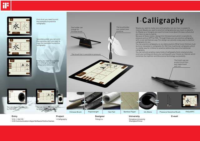 2016年4月7日全球工业设计权威奖项——德国IF设计奖评委会公布了2016年度概念奖的获奖名单。我院工业设计系刘奕廷同学提交的“I Calligraphy”作品从11000多件参赛作品中脱颖而出,获得IF概念设计奖(iF STUDENT DESIGN AWARD 2016)。