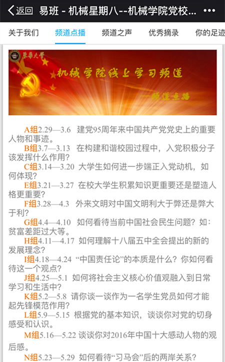活动开展以来,机械学院党校每周在频道上发布讨论话题,在三个月内,共累计发布话题13组,参与回帖达到近1000余条,整理成文10万余字,并且在广大入党积极分子与发展对象中间形成了良好的学习交流氛围。学员们以小组为单位,每周由一个小组负责该周话题的发布与带头发言,极大提高了广大学员的参与度。同时,在线上学习频道内,学员们还可以通过“优秀摘录”、“我的足迹”等子频道浏览同期优秀观点,查看自己的留言情况。