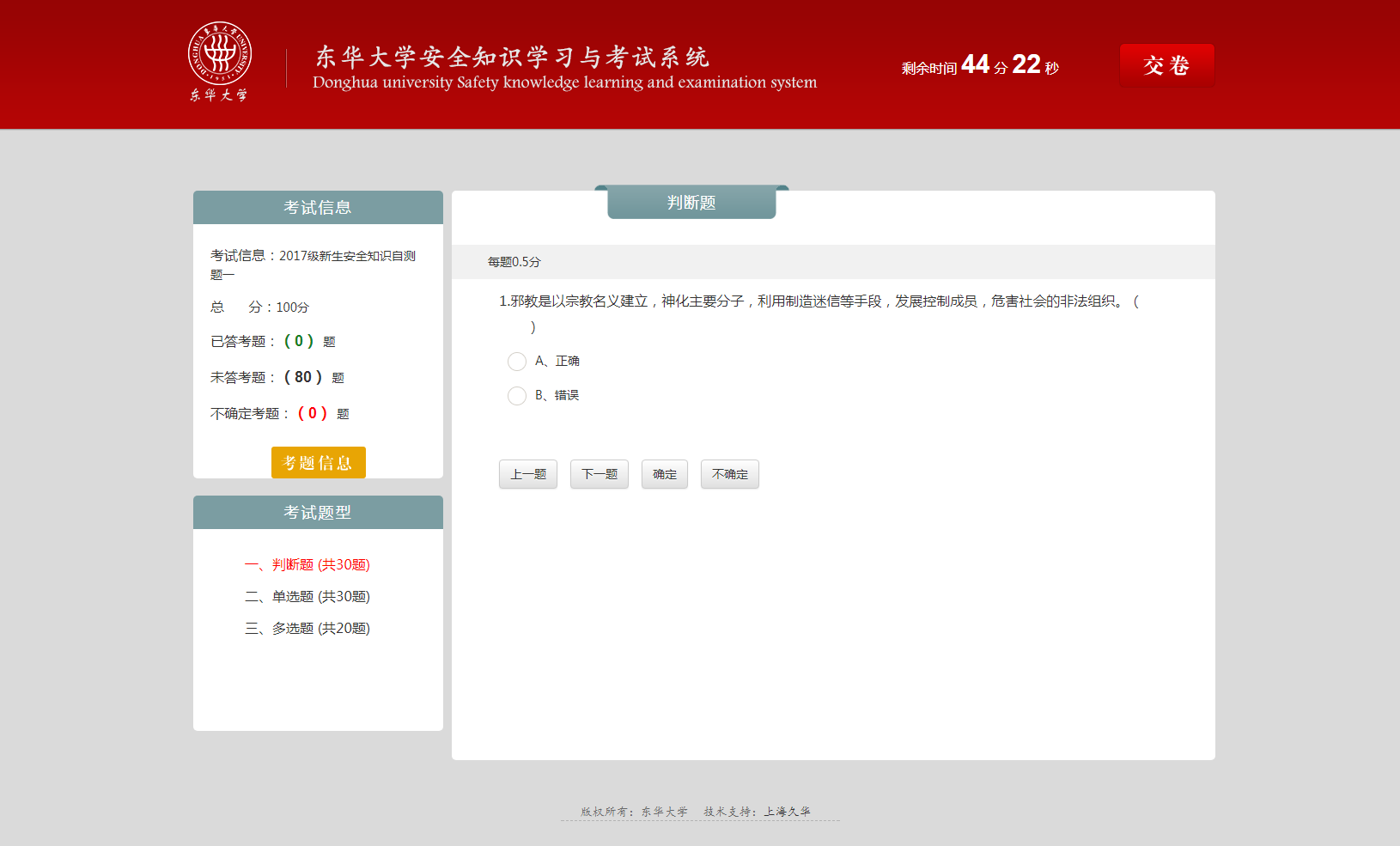 每做完一题,点击“下一题”,直至全部做完,如果有题目答案不明确,可以点击“不确定”,等全部答完后,再做决定。答题完毕后,注意一定要点击右上角的“交卷”,完成测试。