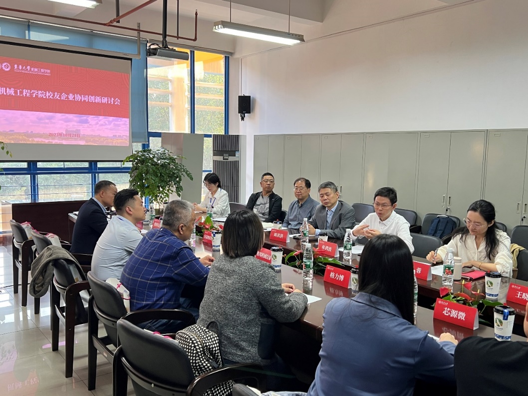 招聘会后,学院举行了“校友企业协同创新研讨会”,会议由机械工程学院院长单鸿波主持,党委副书记杨蓉,副院长周其洪、白涛,系主任于海燕,校友会副秘书长李姝佳,团委书记王晓晖,就业班级辅导员李陈新以及十余家校友企业代表参加座谈会。