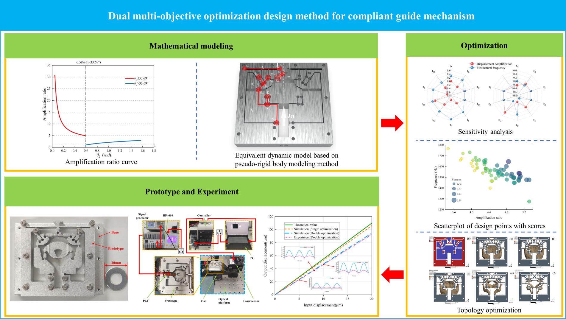 柔顺机构具有精度高、重量轻、易加工、无摩擦、无需润滑等特点,通过弹性构件的挠曲变形实现微纳米位移的精准传递,在超精密作业中扮演重要角色,目前已在精密光学、细胞操纵、可控核聚变、太空探测等高精尖领域得到应用。课题组团队通过构建柔顺机构优化设计新方法,提出了双重多目标优化设计流程,并以“Dual multi-objective optimization design method for compliant guide mechanism”为题发表于国际期刊Structural and Multidisciplinary Optimization(IF: 3.9, JCR Q1),91国产