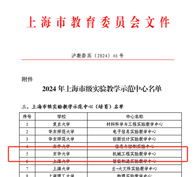 近日,上海市教委公布了2024年上海市级实验教学示范中心名单,我校有4家中心被评为示范中心,其中我院获批机械工程上海市级实验教学示范中心(培育)。