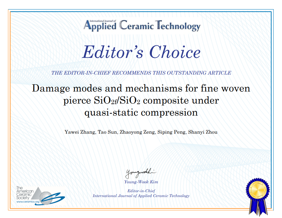 张亚伟副教授团队运用有限元仿真和准静态力学试验方法,对细编穿刺SiO2f/SiO2复合材料准静态压缩行为进行研究,提出纤维编织耦合效应的观点,通过对材料应力场分布,经纬线重叠区域的应力场叠加和应力集中等现象的分析研究,结合界面损伤、基体裂纹、纤维脱粘和纤维断裂多种损伤形式,进一步揭示编织耦合效应在准静态受力过程中的作用和影响机制。该成果近期以“Damage modes and mechanisms for fine woven pierce SiO2f/SiO2 composite under quasi-static compression”为题发表于美国陶瓷学会会刊《International Journal of Applied Ceramic Technology》,东华大学为唯一通讯作者单位,张亚伟副教授为第一作者,论文获得“Editor's Choice”杰出论文奖,文章链接://doi.org/10.1111/ijac.14989。