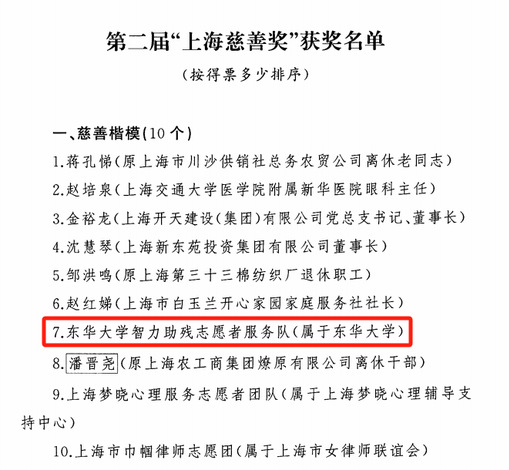 日前,第二届“上海慈善奖”表彰名单揭晓,由上海东华大学教育发展基金会及我院联合推荐参评的东华大学智力助残志愿者服务队获第二届“上海慈善奖”——慈善楷模,学院党委书记王新厚代表领奖并受到上海市委书记陈吉宁、市长龚正的亲切接见。
