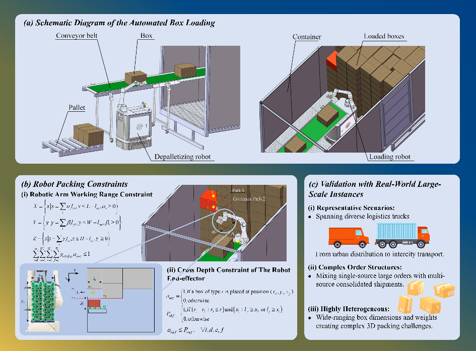 近日,我院智能装备与软件系统团队在机器人卡车装箱优化算法研究方面取得重要进展。该工作近期以“Solving a large-scale 3D packing problem with robot constraints(解决具有机器人约束的大规模三维装箱问题)”为题发表于《Computers & Operations Research》。东华大学机械工程学院为第一单位,青年研究员陈亮为本文第一作者,岳晓丽教授为本文通讯作者。